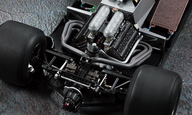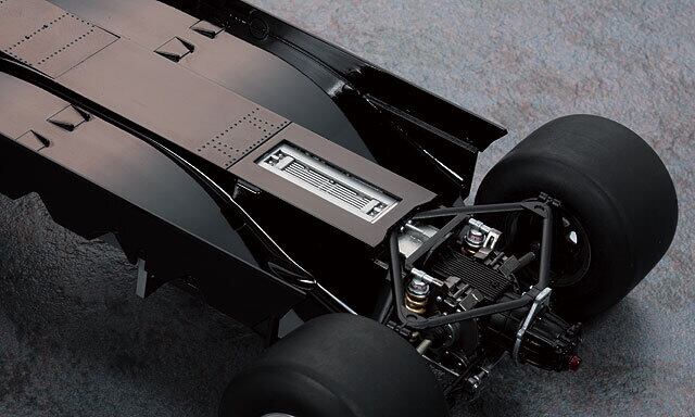 しなやかなボディラインはもちろん、内部のモノコック+V型8気筒DFVエンジン、グランドエフェクトを生み出す車体下面の形状など、実車取材に基づく細部の作り込みによってウイングカーの構造に迫る完成度を実現。